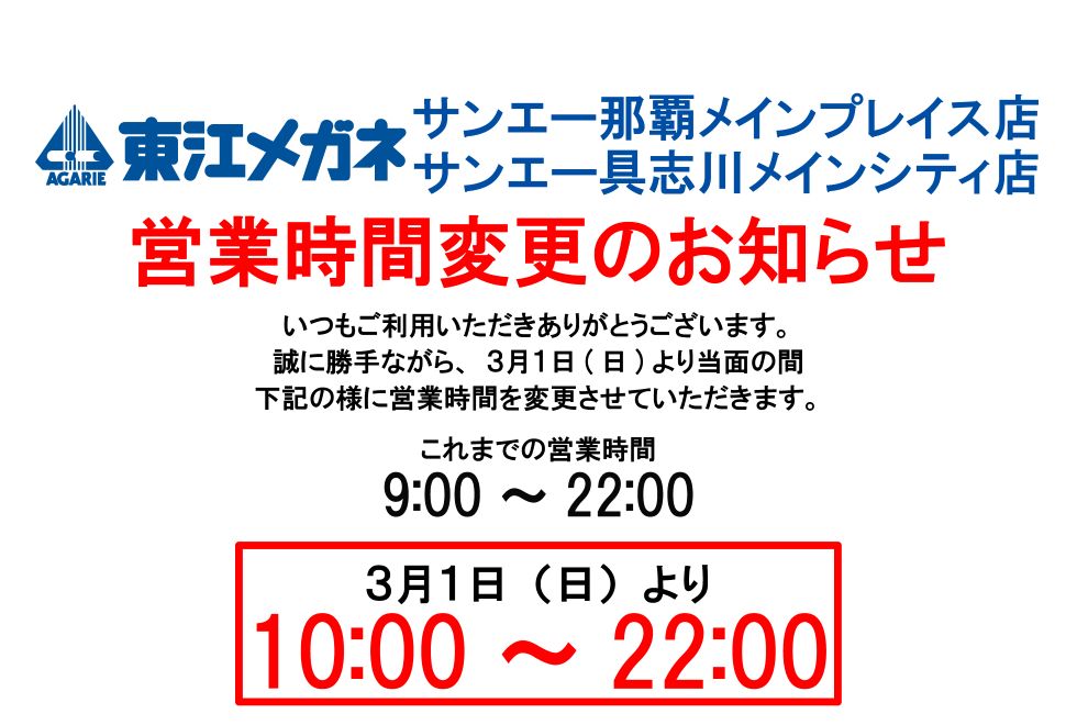 “Agarie Optical shop” is a long-established optical shop located in Okinawa Prefecture, Japan.We sell eyeglasses, hearing aids, contact lenses, sunglasses and emergency eyeglass repair.