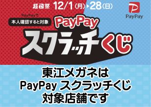 PayPayスクラッチくじ 東江メガネは対象店舗です♪ 12月1日(月)~28日(日)の期間、 PayPayスクラッ...続きを読む -