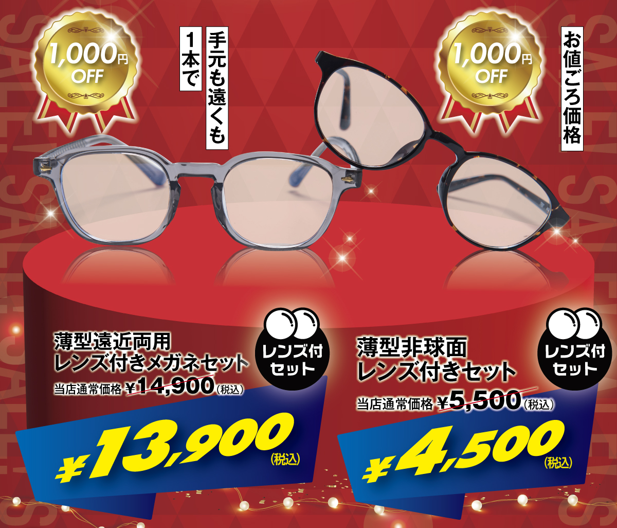 薄型遠近両用レンズ付きメガネセットも大還元祭価格で¥13,900!